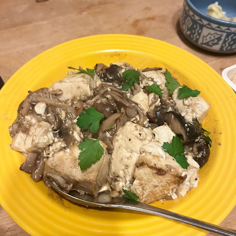 冷凍庫からしめじ、えのき茸、舞茸、椎茸出してきてソテーして木綿豆腐と合わせて