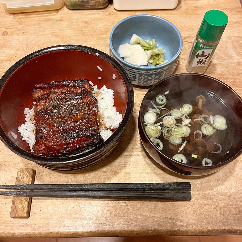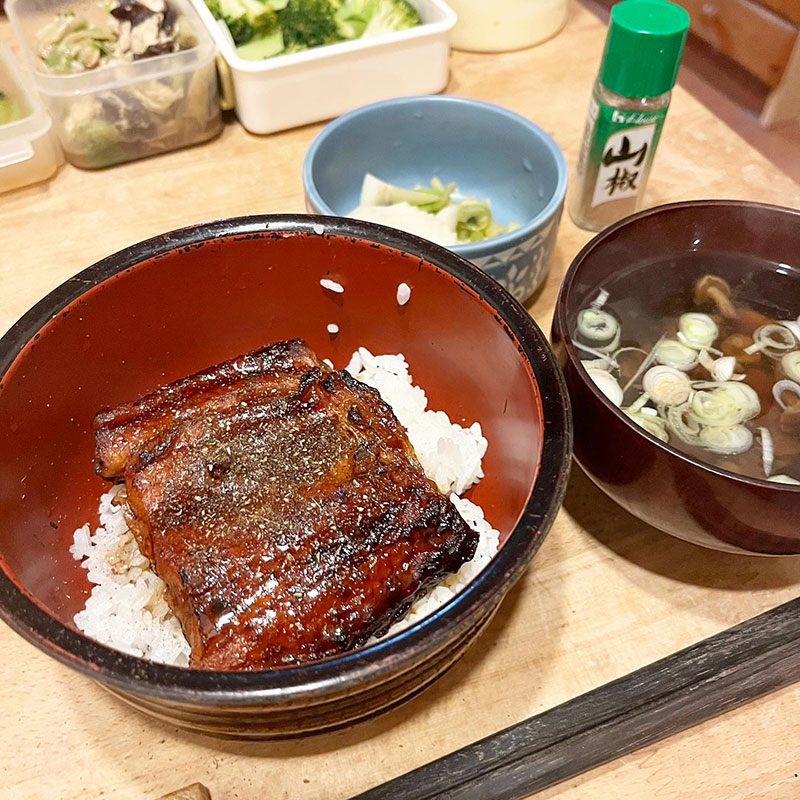今宵は鰻丼。スーパーの中国産だけどカミさん、お湯で洗ったり魚焼きグリルで焼いたりごにょごにょやってくれてる間に