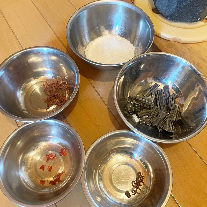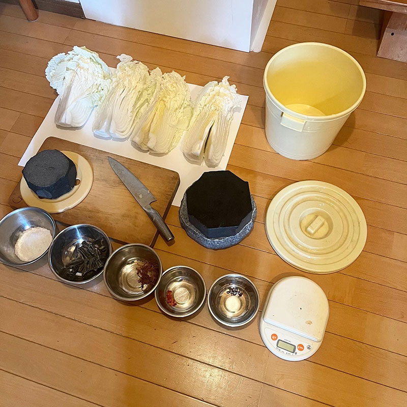 白菜の重さの3%の粗塩。風味付けに柚子の皮を干したもの、白菜漬け用に細く切って干した切干大根、畑の赤唐辛子を干したもの、北海道の昆布。