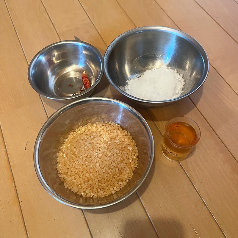 約2kgに対して粗塩60g、ザラメ200g、酢40cc。風味付けに干した柚子皮と赤唐辛子。
