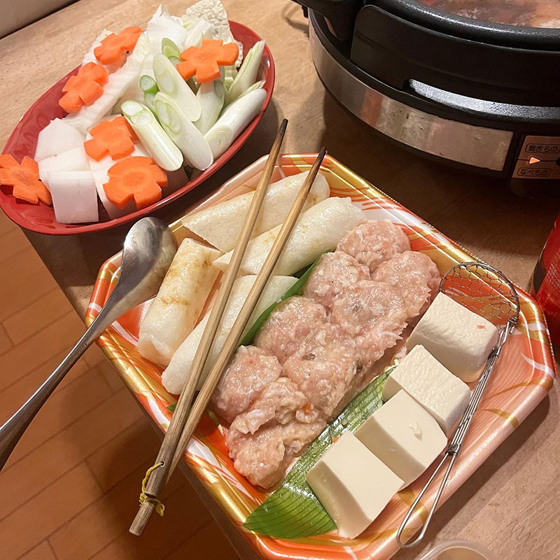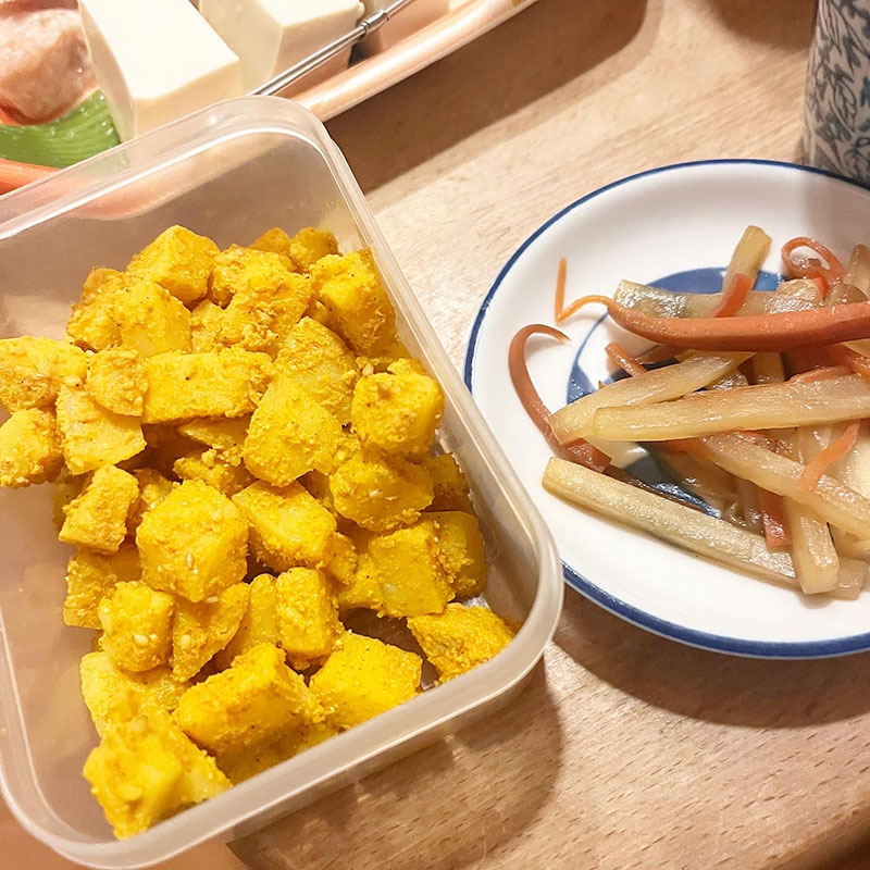 昨日仕込んだじゃがいものスパイスナムル。〆のきりたんぽが美味いなぁ。