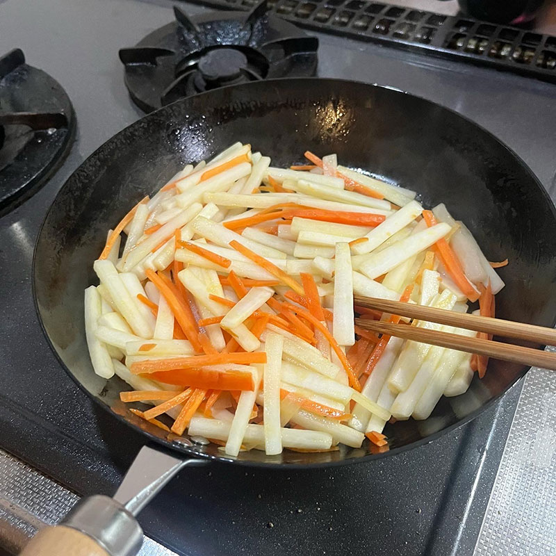 鍋に入れる大根の皮を太く剥いてそれはニンジンときんぴらに。