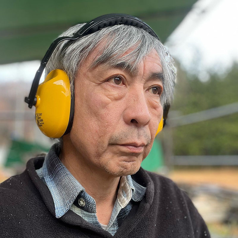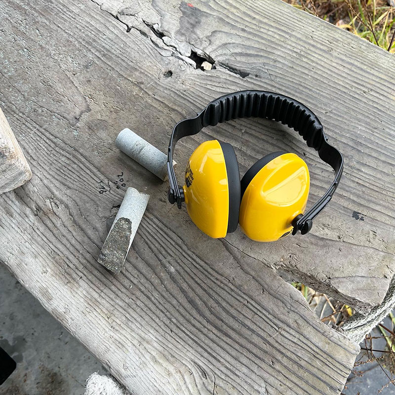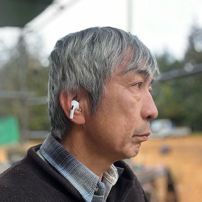 これ以上、難聴が進まない様に制作に導入した AirPods。石を削る際に出る大量の粉塵で壊れないように
