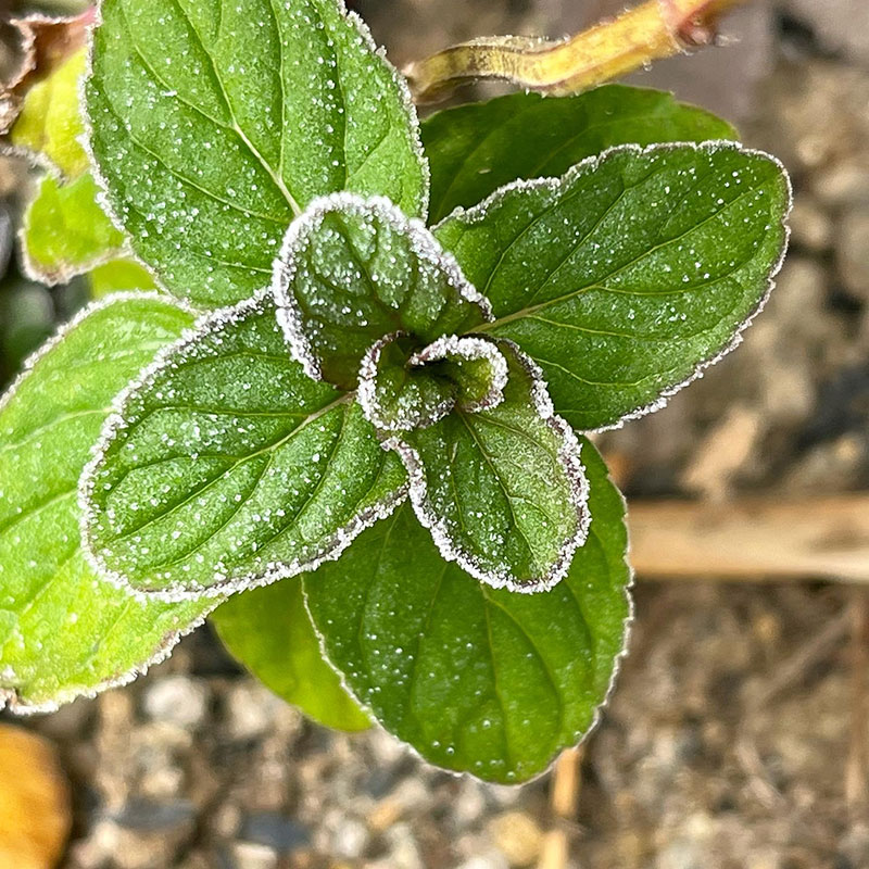 寒くて目が覚めたら朝。霜の降りたパセリ、