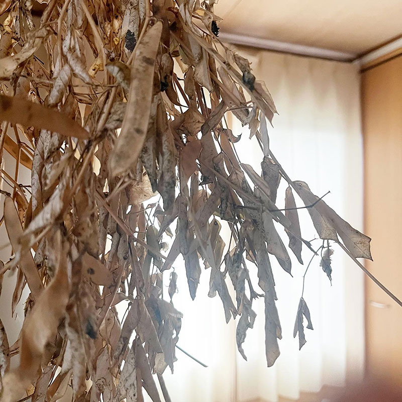 自家採種用に玄関の軒先に吊るしていたバタフライピーは家の中に取り込んだ。
