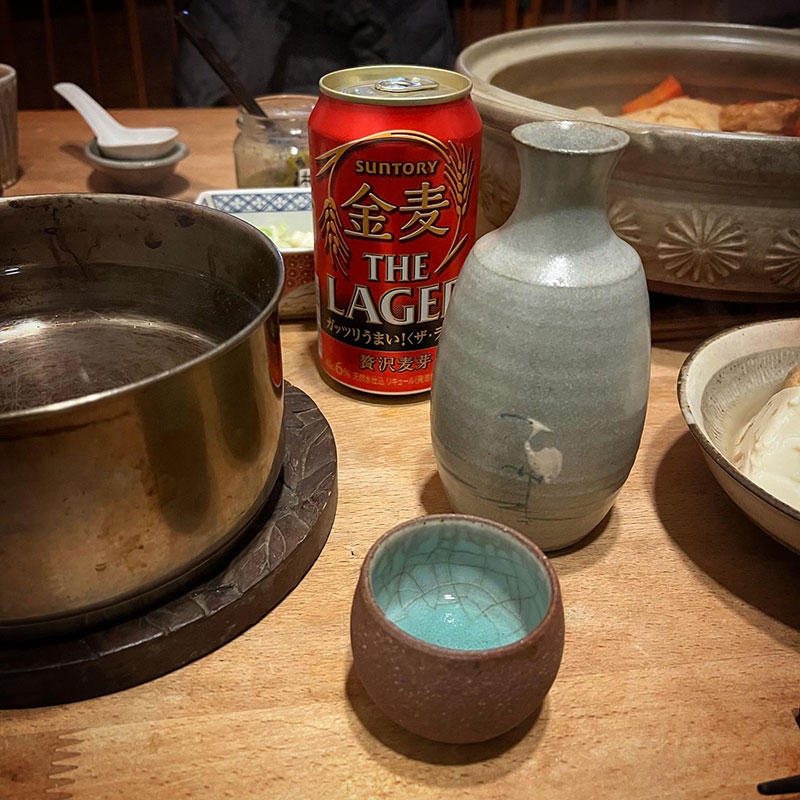 冷えたので最初、秋田の日本酒、高清水を熱燗で。そしていつもの赤い金麦。