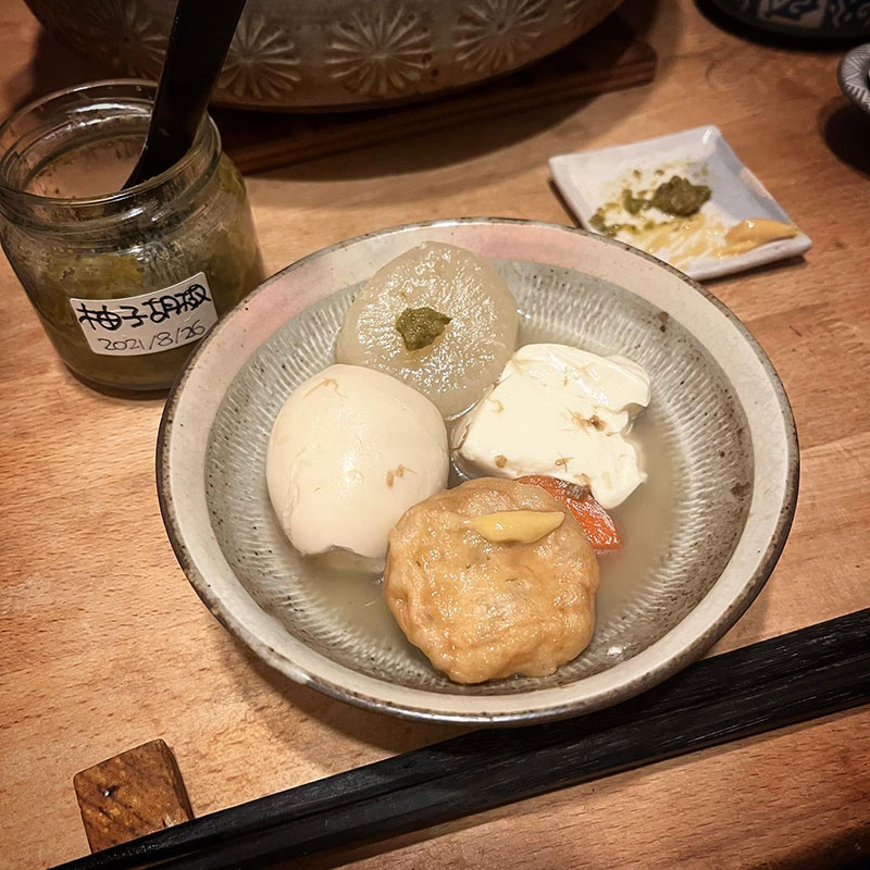 柔らかく煮えたおでんはからしより一年熟成させた自家製の柚子胡椒の方が美味しい。