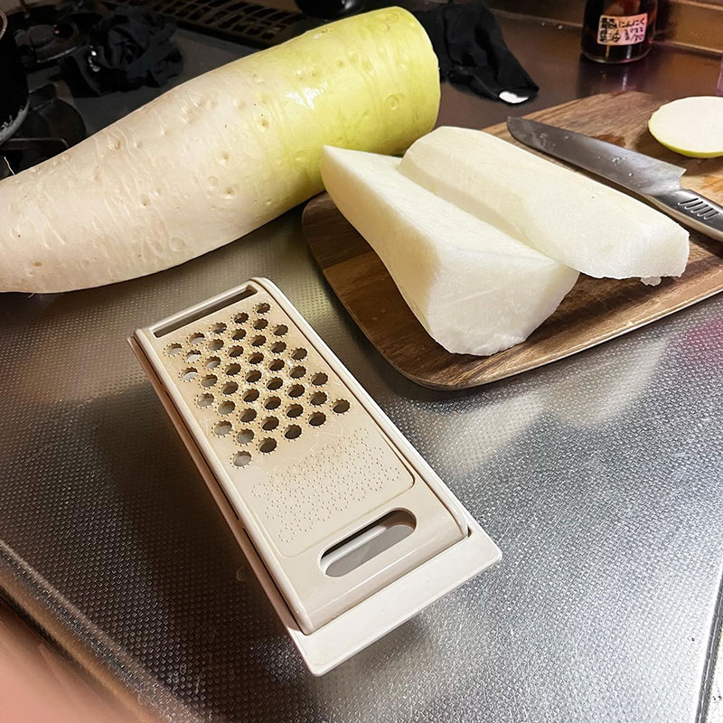 昼に太くて大きな大根をいただいたので首の辺り少し切って大根おろしに。おろし器より太くて半割にしてやっとおろせた。どんだけ太い!