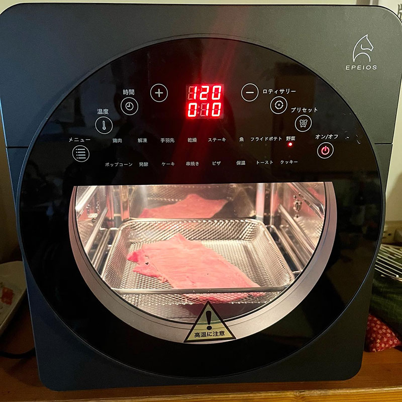 僕もカミさんももう歳で脂に酔ってしまうので脂身の多い部分はエペイオス ノンフライオーブンで低温120℃で10分焼いてみた。