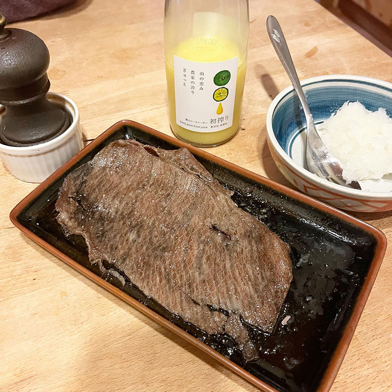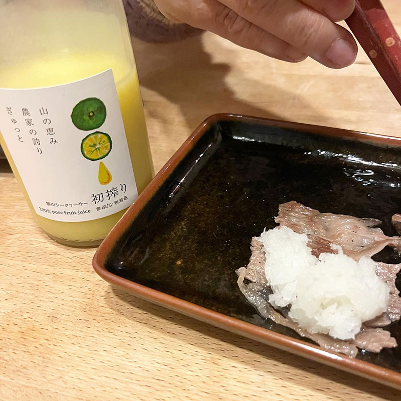蕎麦つゆ作りで出た絞った大根おろしを塩胡椒で味付けした仙台牛に乗せて更にMaoさんにもらった初搾り出しシークワーサーをかけて肉で巻いて食べてみた。美味くて悶絶。