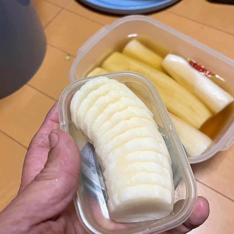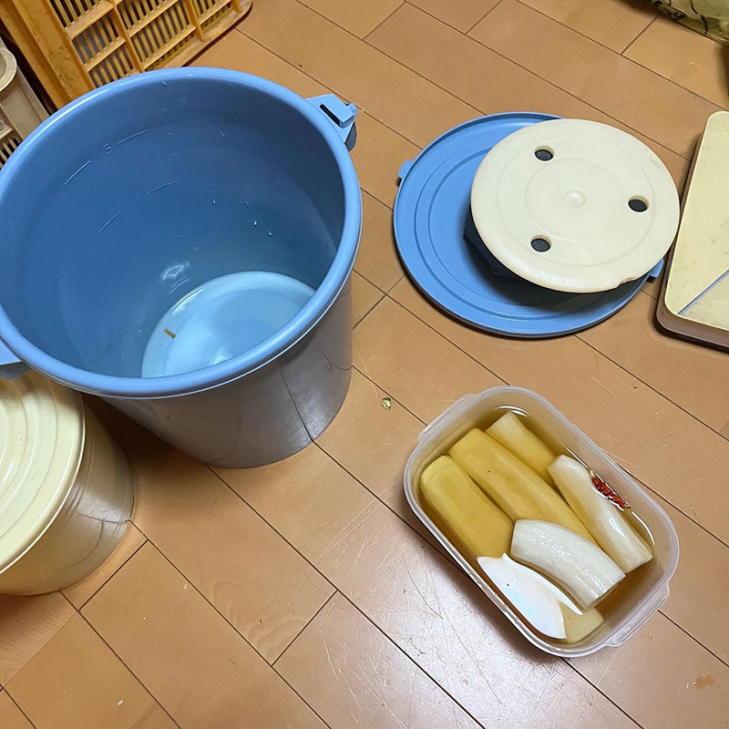 大樽じゃないと漬けられないので漬けていた大根の生漬け、
