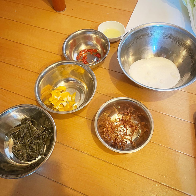 これだけでかいから茎が厚くて上手く漬かるとこれが甘くて美味しいんだ。風味付けは柚子の皮、白菜漬け用に去年干しておいた細い細い切干大根。