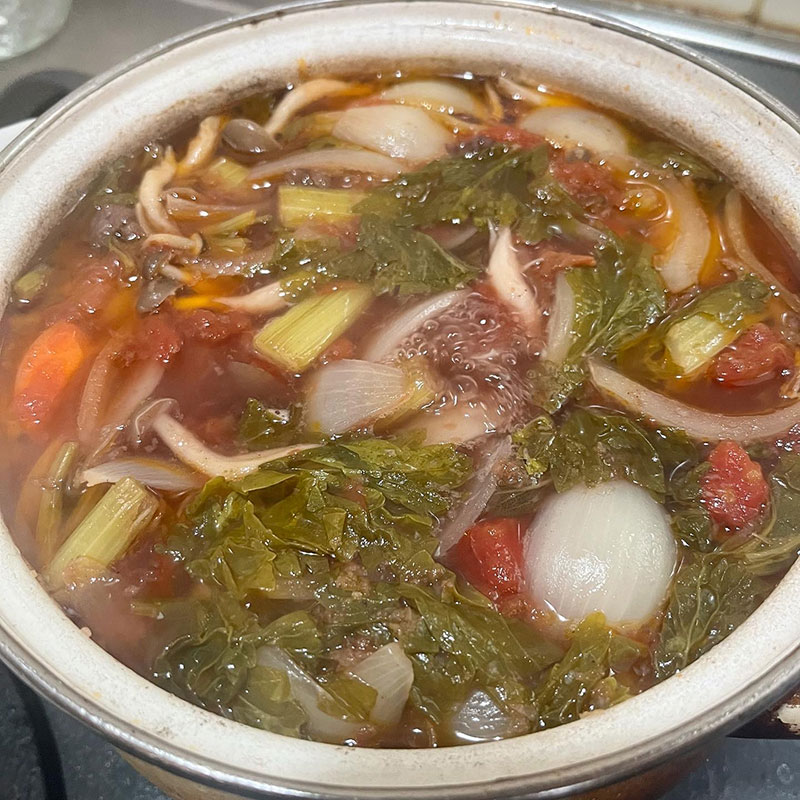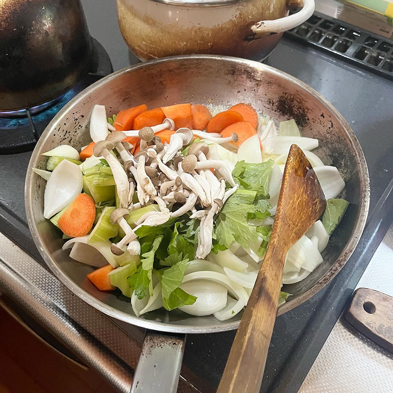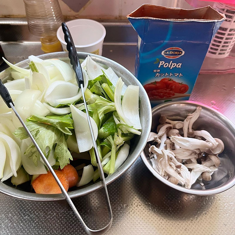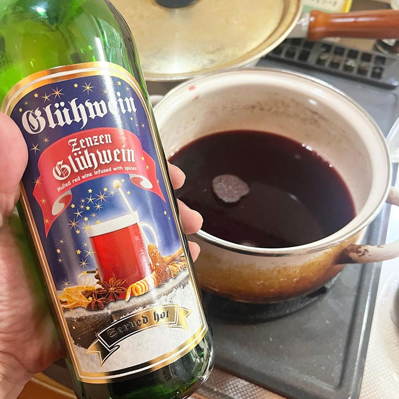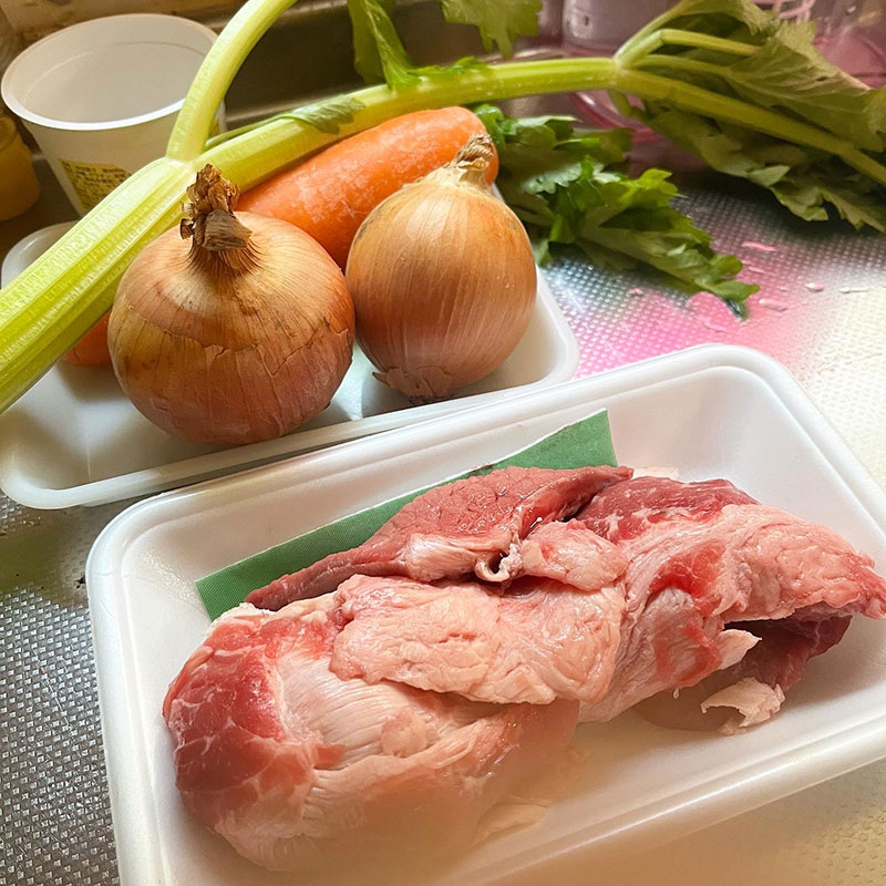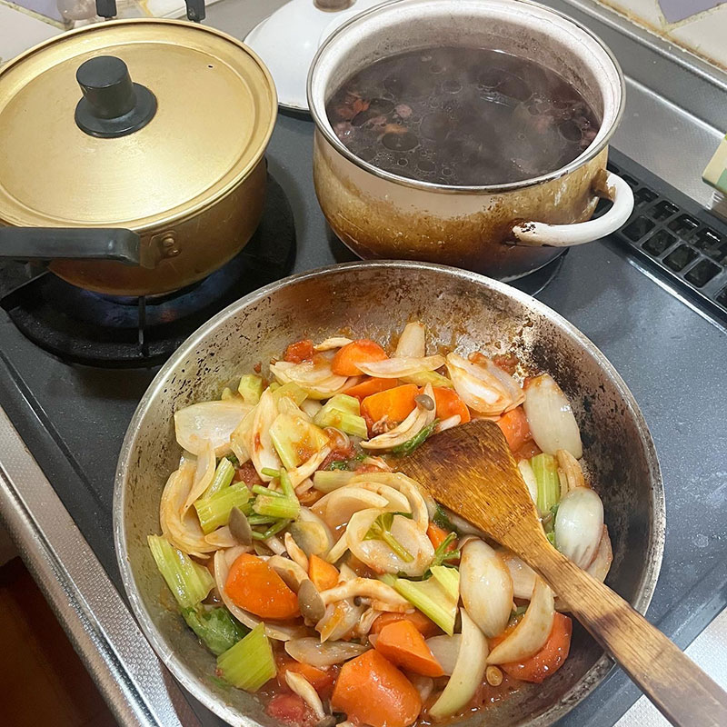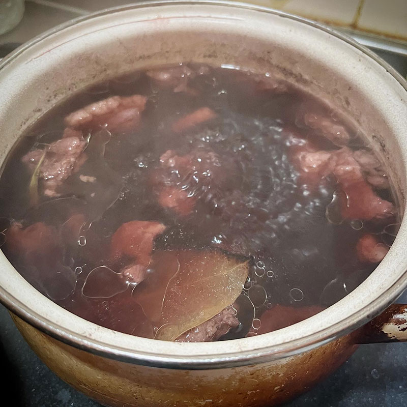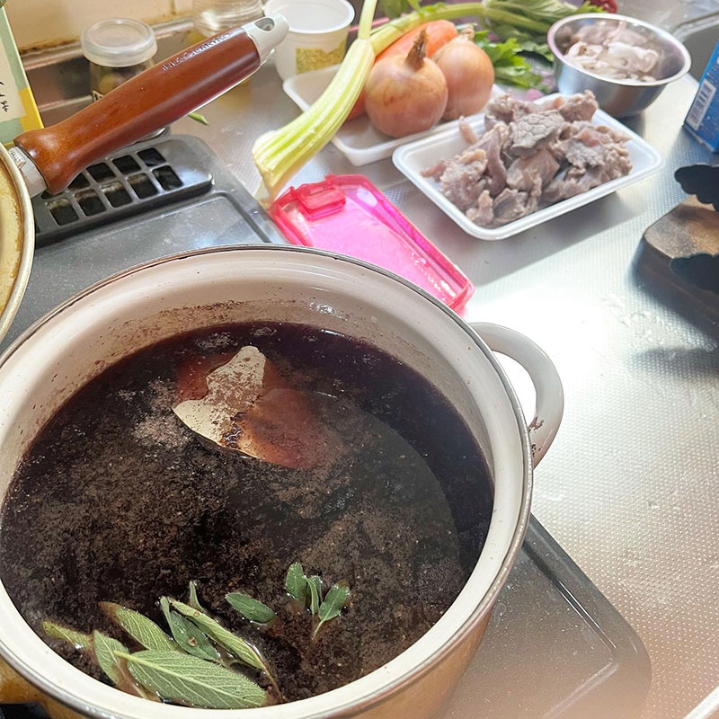 下茹でして臭みをとったスネ肉を家の月桂樹やセージ、各種スパイスを入れた赤ワインで煮込む。