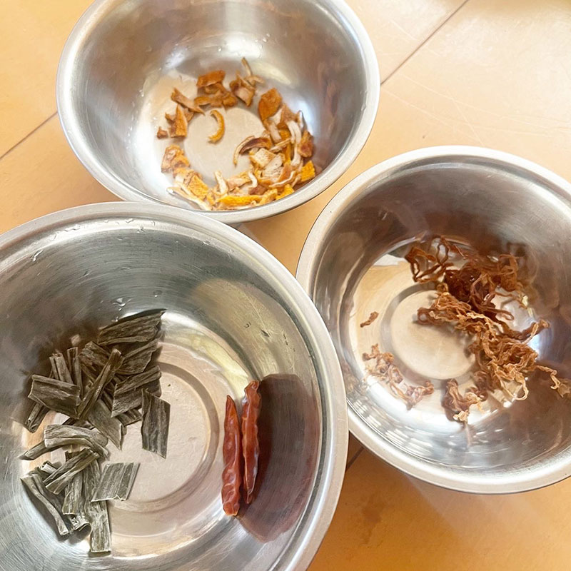 風味漬けに去年、白菜漬け用に極細で作っておいた切干大根、干して保存しておいた柚子の皮、赤唐辛子、北海道の昆布を風味付けに挟みながら。