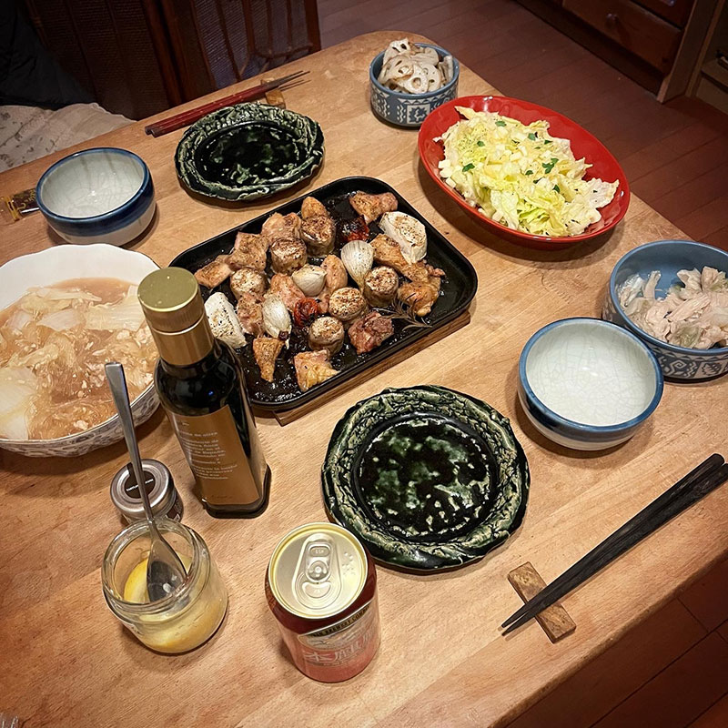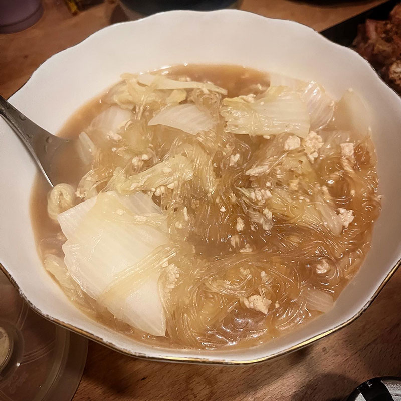 カミさんは近所の方にいただいた白菜を豚ひき肉と春雨とで炒め煮にしてくれた。生姜が効いてて美味しい。