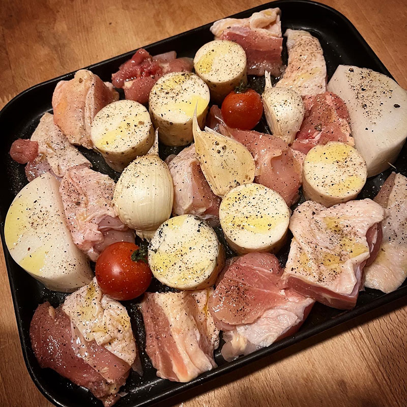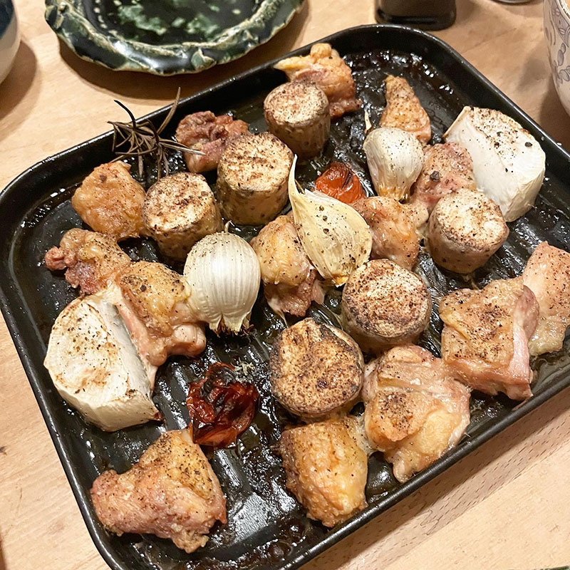 鶏もも、青森のにんにく、大根、ミニトマトをグリル。