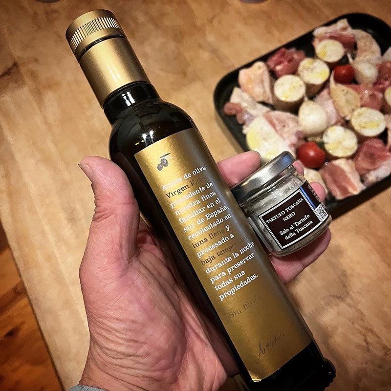 幼なじみのまゆみさん( @shoe.education )にもらった満月の日にだけ収穫するスペインの満月のEXオリーブオイルとトリュフ塩を振りかけて