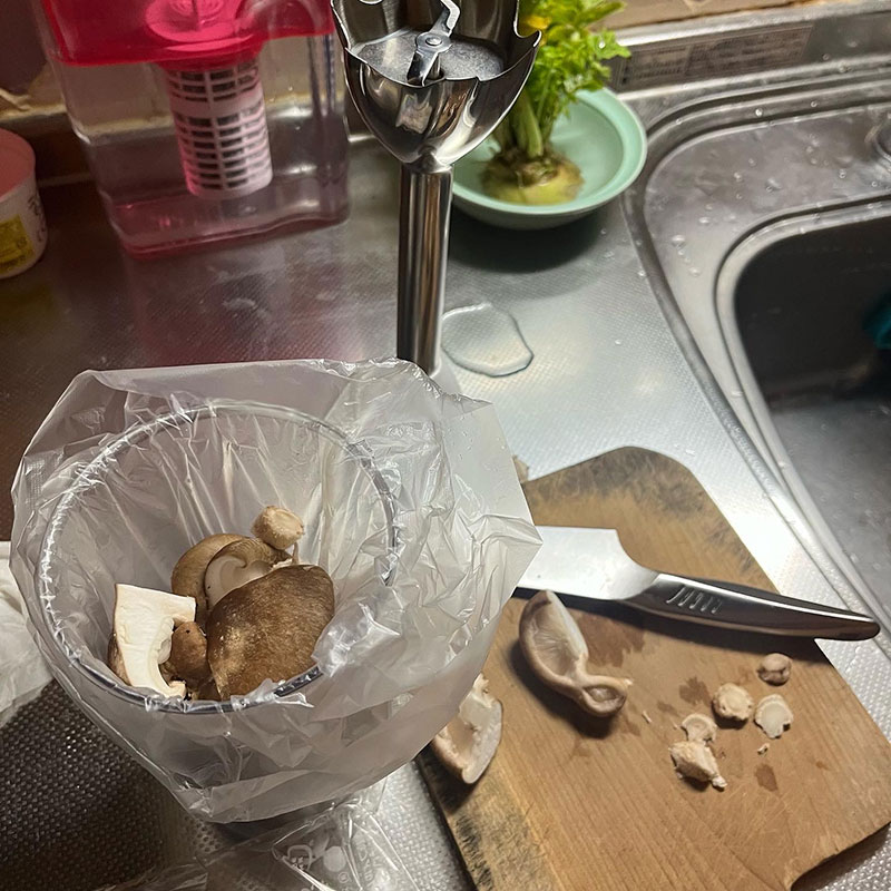 カミさんが椎茸買ってきたので石づきだけ落として冷凍する。使う予定が無くてもいろんなきのこ買っておいてすぐ冷凍。