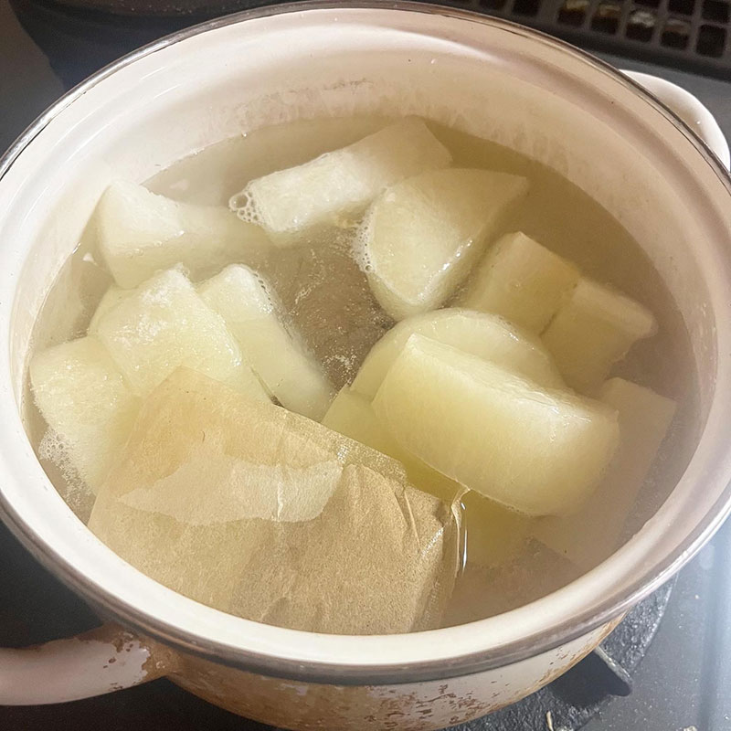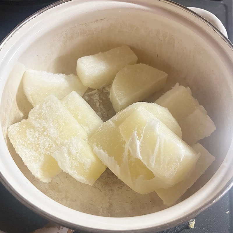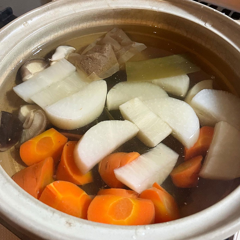最近ネットで大根の煮物は一度冷凍してから作ると時短で味も染み染みになって美味しいってやたら出てきたので、試してみようと思って冷凍しておいた大根を、
