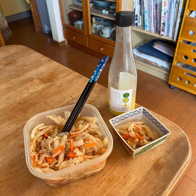 沖縄のその年に初めて絞った果汁だけを集めた初搾りシークヮーサー。Maoさんにもらって何にでもかけて使ってるんだけど先日作ったラーパーツァイにも混ぜてみた。