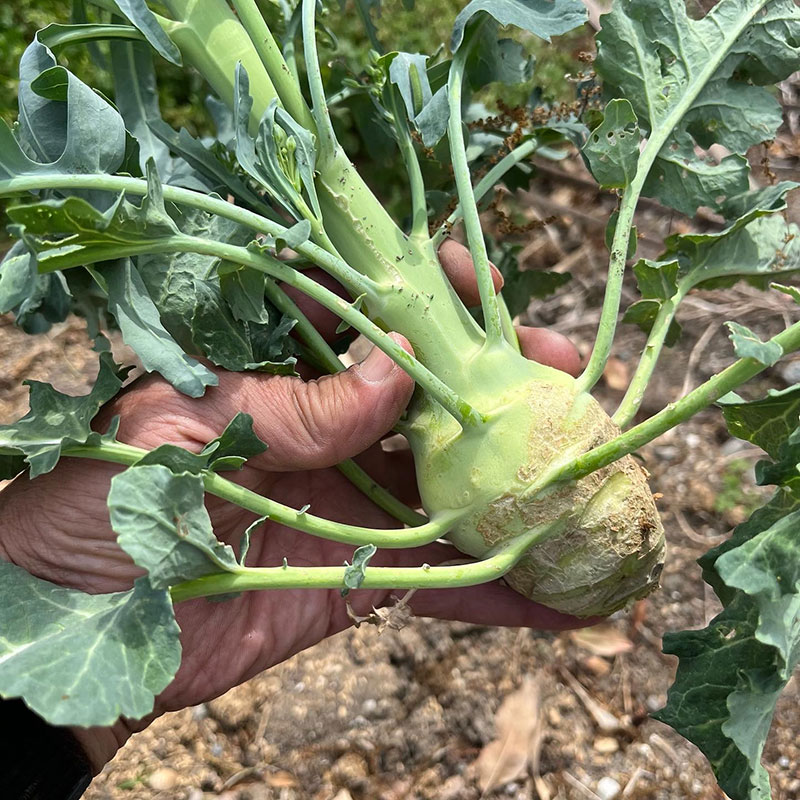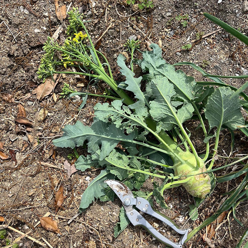 秋の収穫までに大きくならずに畑で冬を越したコールラビ。