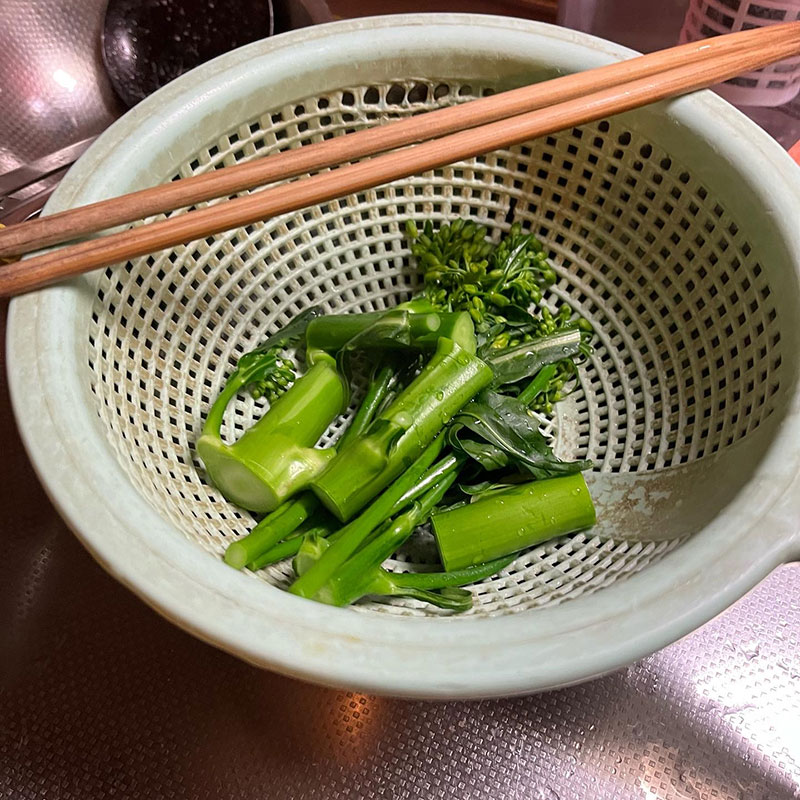 太い茎だけは茹でても硬くて食べられなかったけど菜花もソテーも美味しかった。あとふたつある!