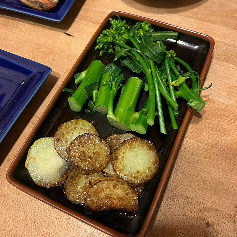 菜花は茹でて、地上の丸く肥大化した茎はオリーブオイルでソテー。