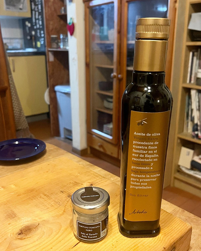 友だちにもらった年に一度だけ満月の日に収穫する無濾過のEXヴァージン・オリーブオイル”アルベキア”とイタリア・トスカーナの黒トリュフ塩のシンプルな味付け。