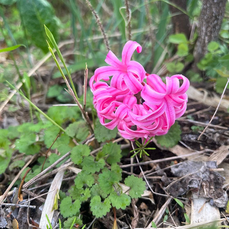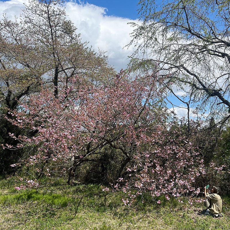 “御衣黄桜”を見た。その帰り道、道端に咲いてる二輪草を教えてもらった。ひとつのところから必ず二輪花が咲く。