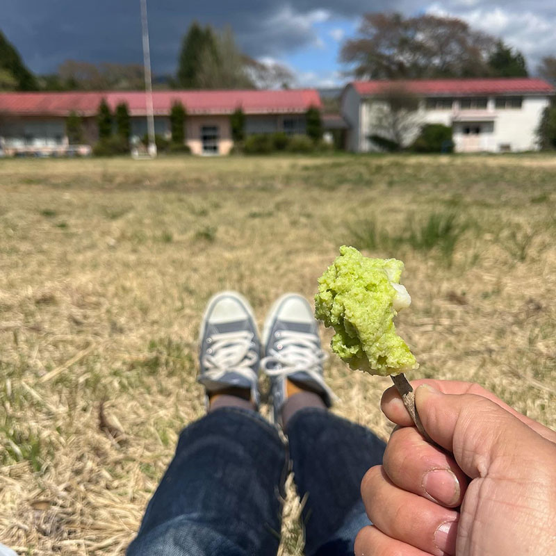 食後に産直広場あぐりっとで買ってきたずんだ餅。箸が無いので校庭に落ちてた木の枝でひっかけた。あぐりっとのずんだは本当に美味しい。それに作りたてだったか今日の餅の柔らかいこと!