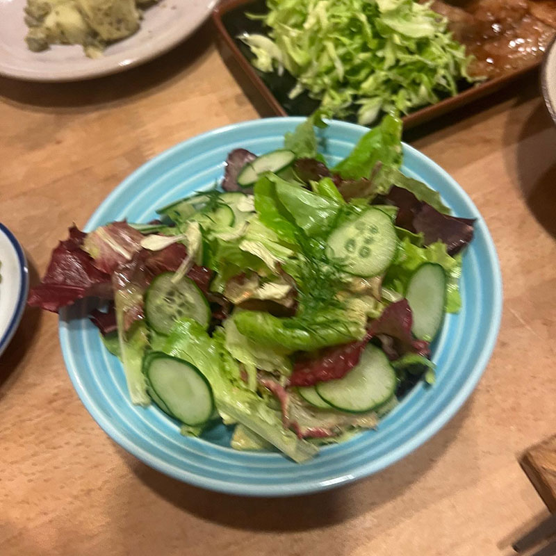 にん(じんと)たま(ねぎの)ドレッシングでサラダ。