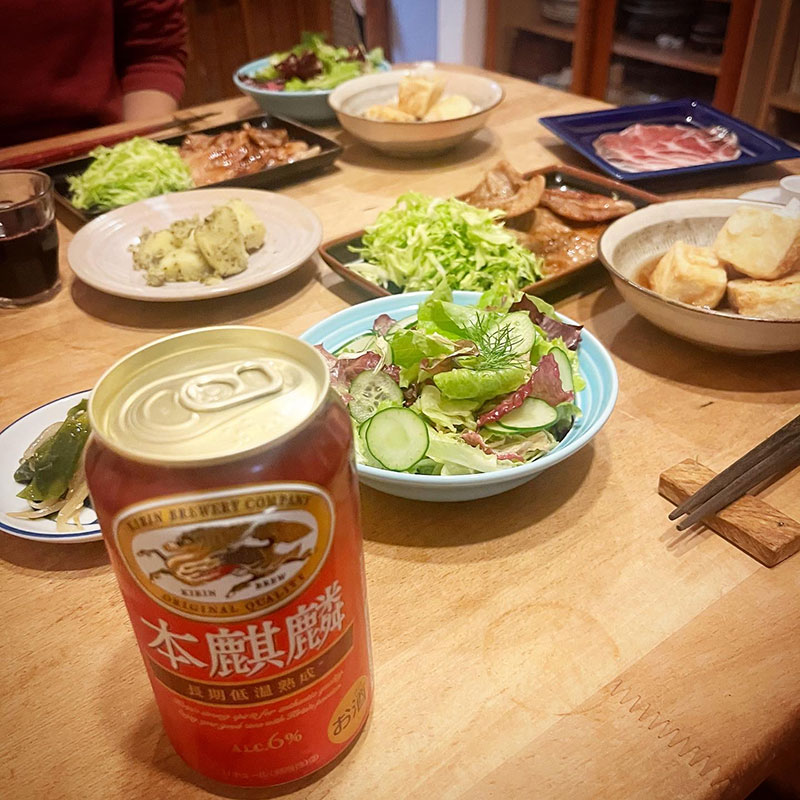 塩蔵わかめの和え物。ジェノベーゼポテト。生ハム。本麒麟。