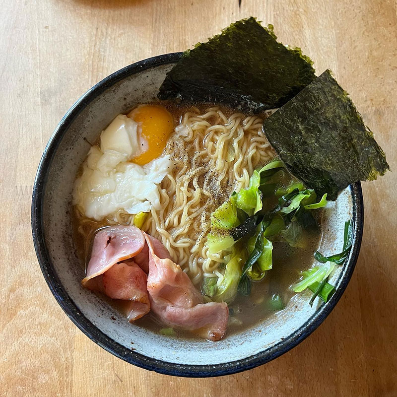 ニラ、キャベツ、アスパラガス、ベーコン、卵、海苔。