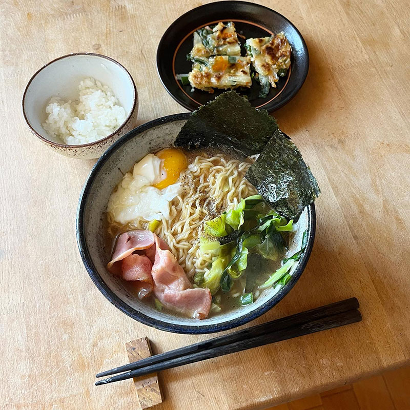 ラーメンライスの昼飯。昨日の残りのチヂミ。