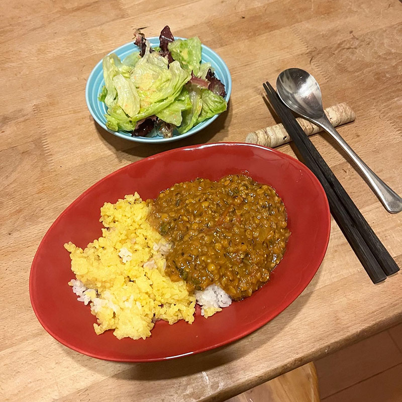 昨日仕込んだスパイスカレーの夕食。ターメリックライスで。ダルカレー(豆のカレー)とキーマカレー(ひき肉のカレー)の良いとこ取りしようと思ってレンズ豆と豚ひき肉としめじで仕込んだんだけどレンズ豆だけでコクと旨みあるからひき肉入れる事なかった。しめじの旨みは美味しさに貢献してる。