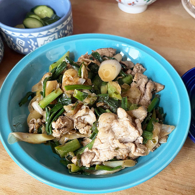 昼飯のおかず。葉玉ねぎと豚肉の炒め物。
