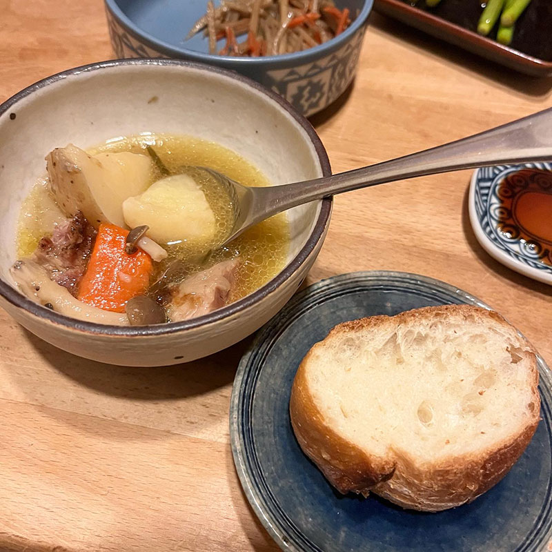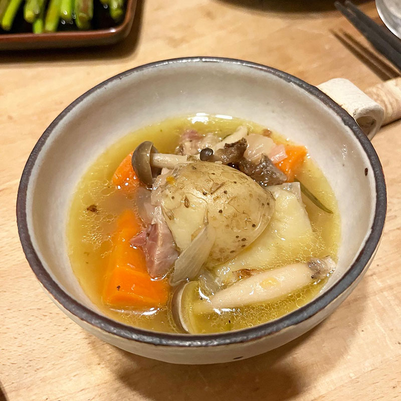 アイスバインと根菜ときのこ、そしてアイスバインのすね肉の骨も一緒に香草と3日間コトコト煮込んだポトフ。