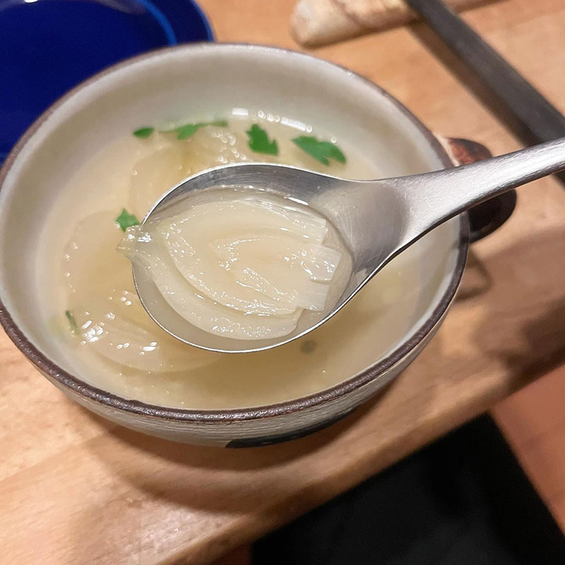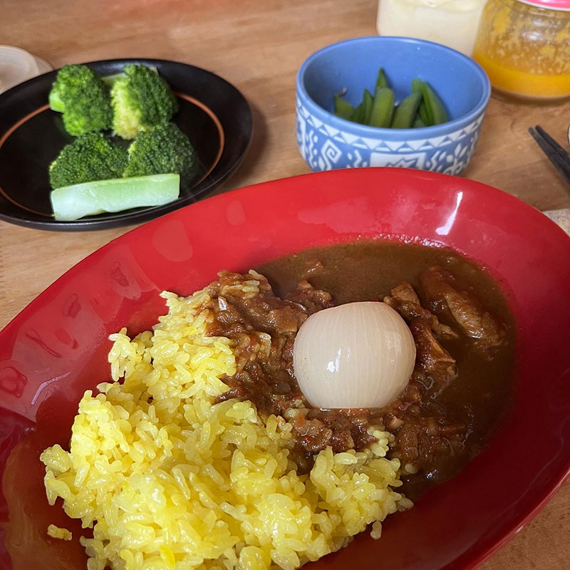 カミさんがブレンドされた市販のスパイスでカレー作るというので、水を足すところを大量に仕込んだ新玉ねぎのスープを代わりに使ってもらった。カスリメティ香るそのスパイスカレーの昼飯。