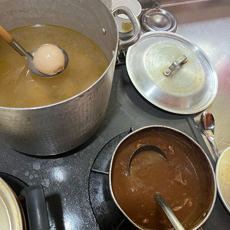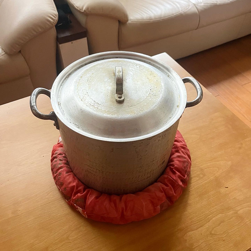 寸胴で煮てるスープ、昨晩沸騰させて魔法の鍋帽子でくるんでおいたら朝、まだ熱くて寸胴の取手さわれなかった。