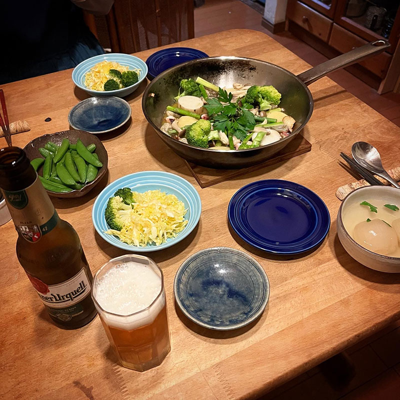 味変するのも美味しい。スナップえんどう。キャベツのにんたまドレッシング和え。妹にもらったピルスナーウルケルで乾杯。これで最後。美味しかった、ごちそうさま。