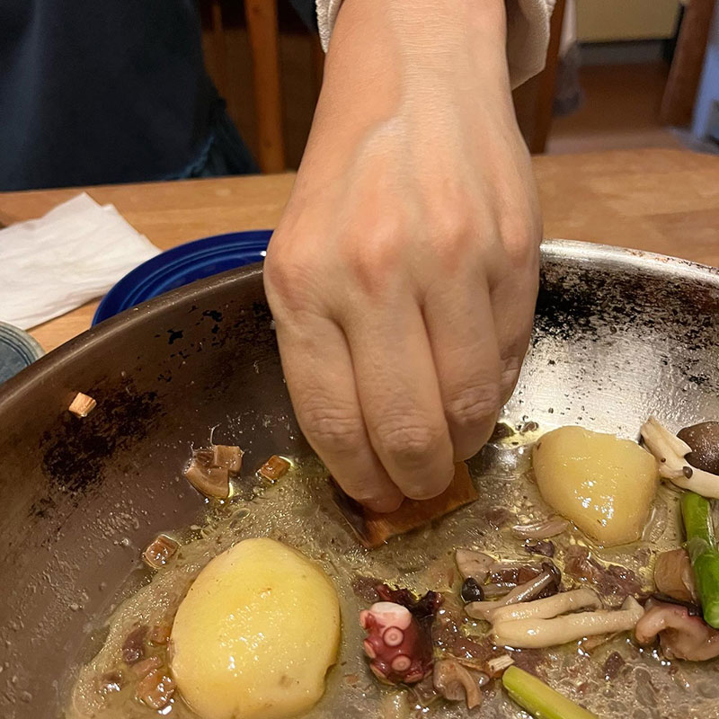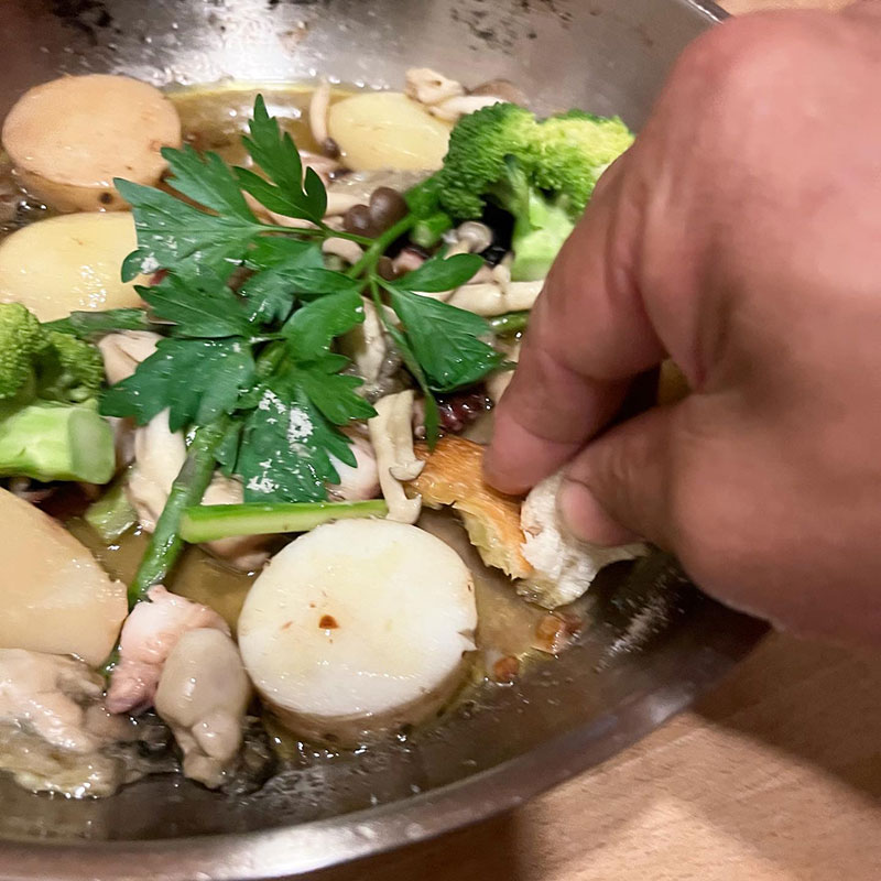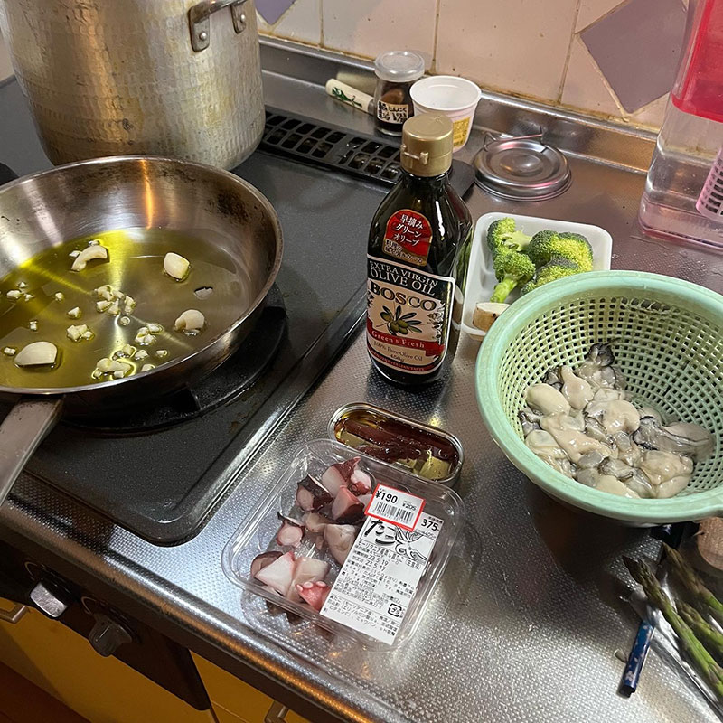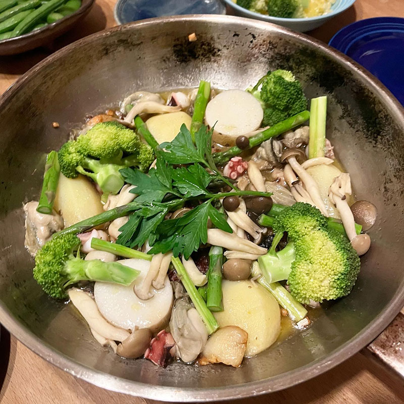 オリーブオイルににんにくの香り移してアンチョビで塩味つけて今宵は海鮮。牡蠣、タコ。野菜はいただいたアスパラガス、山芋、しめじ、茹でてないじゃがいもとブロッコリー。最後に畑からイタリアンパセリ採ってきて放り込んで出来上がり。