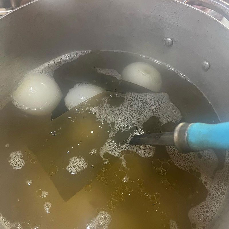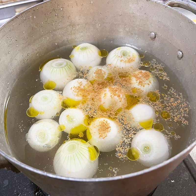 スープ明日には出来上がる。最初はシンプルに小さな新玉ねぎを味わって、大量に作ったから味変しながら楽しむ。