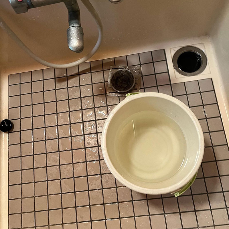 バケツ8割(約6L)の水にバスフレッシュ。添付の計量スプーンで一杯(15cc)。