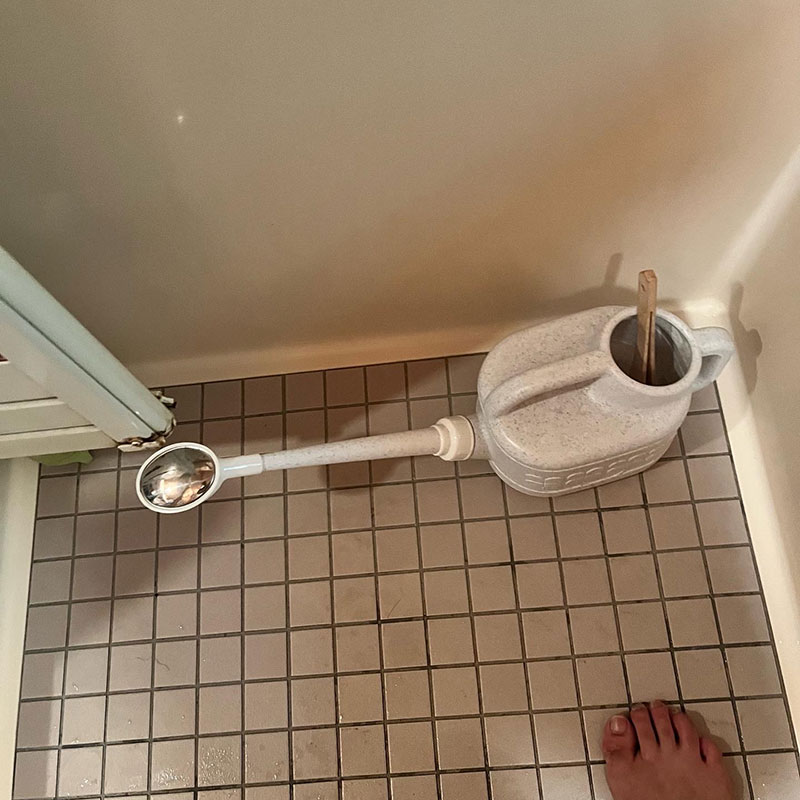 壁の重点的にかけたいところにジョウロは便利。黒カビを死滅させるには60℃のお湯をかければいいが天井にかける方法考える。