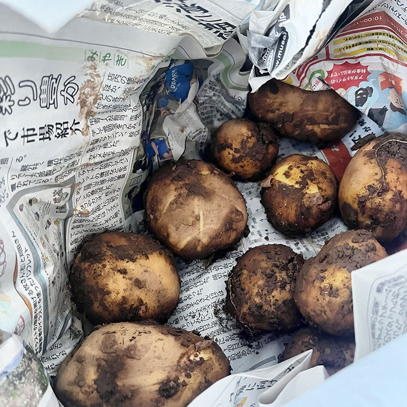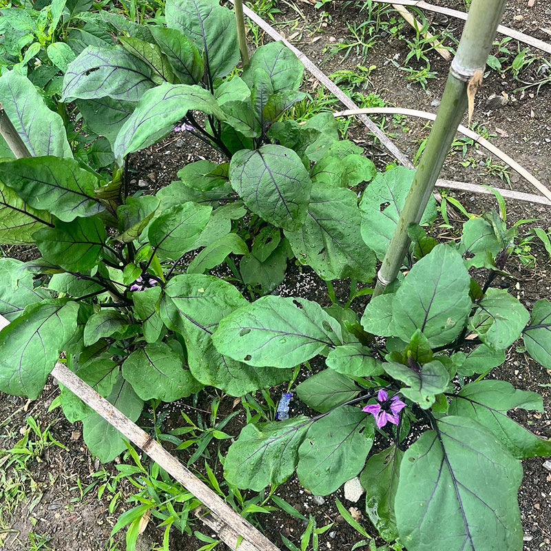 今朝、株の負担を減らすために一番花の実をとった茄子。2種類3本。