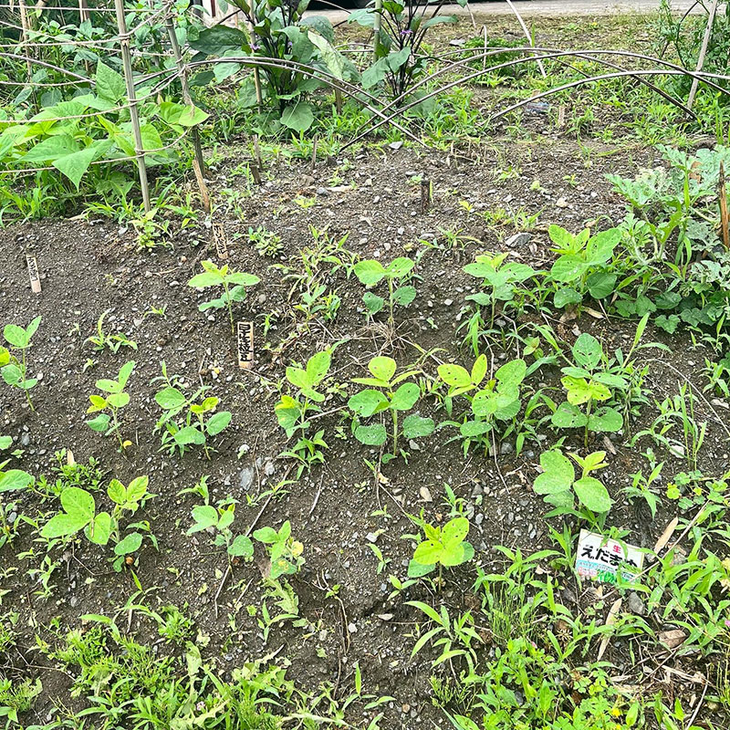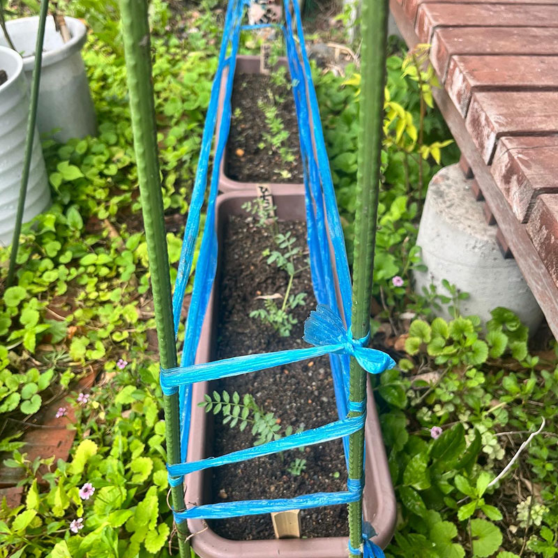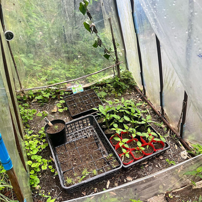 庭の猫の額ハウス。万願寺とうがらしの苗。コキア、ひまわり。