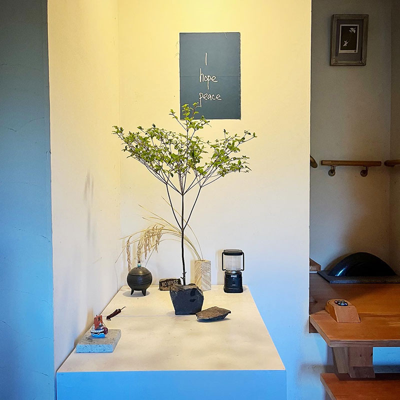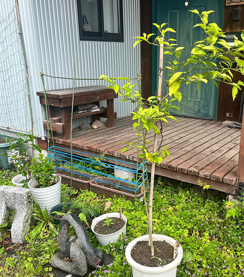 玄関前の鉢。高知の柚子。モヒートミント イエルバブエナ(夏のモヒート用のキューバのミント)、まりこさんにもらったローズマリー、カレーリーフ、赤唐辛子、徳島のすだち。