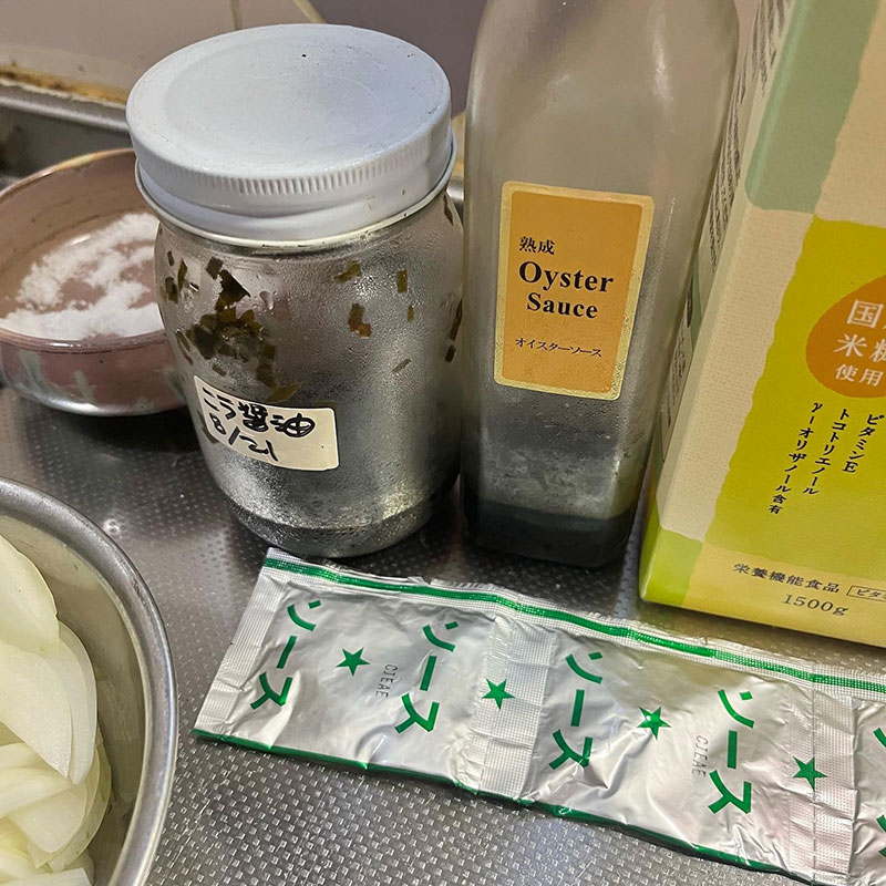 味付けは添付のソースは半分でオイスターソースと自家製のニラ醤油。