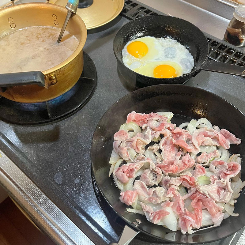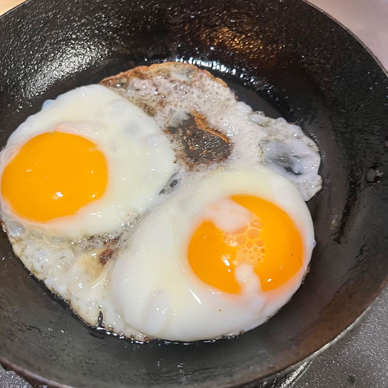鉄のフライパンで蓋をしないで超弱火で焼くと白身はカリカリ、黄身はトロトロに。でも、かなり時間がかかるので焼きそばの調理と同時に焼き始める。