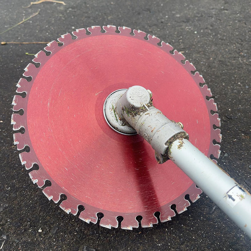 支給されるこの草刈り刃がよくできていて石やコンクリートに当たってもチップが飛ばない。そしてよく切れる。